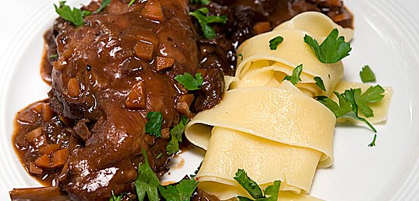 - Kurz vor Ende der Schmorzeit die Bandnudeln in kochendem Salzwasser bissfest garen. Abgießen und etwas Butter untermengen.