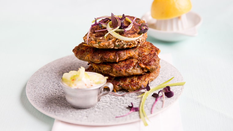 Aus der Masse mit angefeuchteten Händen ca. 8-10 flache Bratlinge formen. Jeweils etwas Bratöl in einer beschichteten Pfanne erhitzen und die Bratlinge darin portionsweise bei mittlerer Hitze auf beiden Seiten je 3-4 Minuten knusprig braten. Herausnehmen und mit dem Dip servieren.