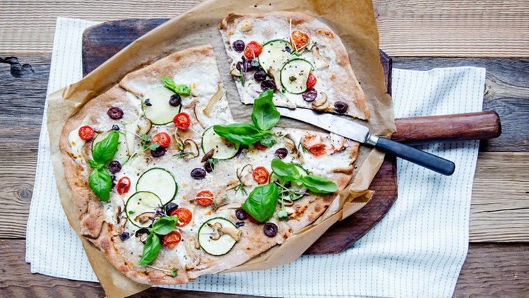 Den Backofen auf 250 Grad vorheizen. Den Teig auf einer bemehlten Arbeitsfläche durchkneten und auf Backpapier zu einem dünnen Oval ausrollen. Mit dem Frischkäse-Mix bestreichen und Zucchini, Pilze, Tomaten, Oliven und Mozzarella darauf verteilen. Mit Salz und Pfeffer würzen, mit Rosmarin bestreuen und mit dem übrigen Olivenöl beträufeln.