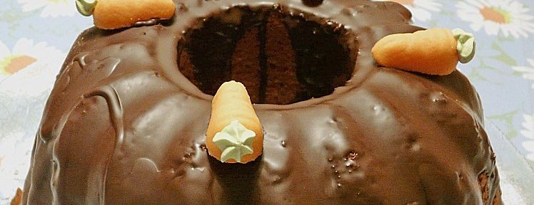 - Im vorgeheizten Backrohr bei 180° Grad ca. 50 Minuten backen. Etwas auskühlen lassen und stürzen. Mit Schokoladenglasur überziehen und mit Zuckerkarotten verzieren.