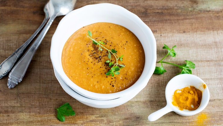 Passierte Tomaten hinzugeben und noch einmal kurz aufkochen. Mit Curry, gemahlenem Koriander, Kümmel, Salz und Pfeffer sowie mit etwas Zitronensaft abschmecken. Die Suppe fein pürieren. Nach Belieben mit gehackter frischer Petersilie bestreut servieren.