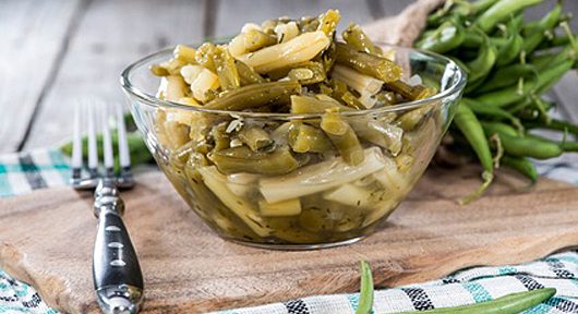 In eine Jenaer Glasform die Senfkörner, Zwiebelscheiben und das Dillkraut geben. Dann die Bohnen hineinschichten.