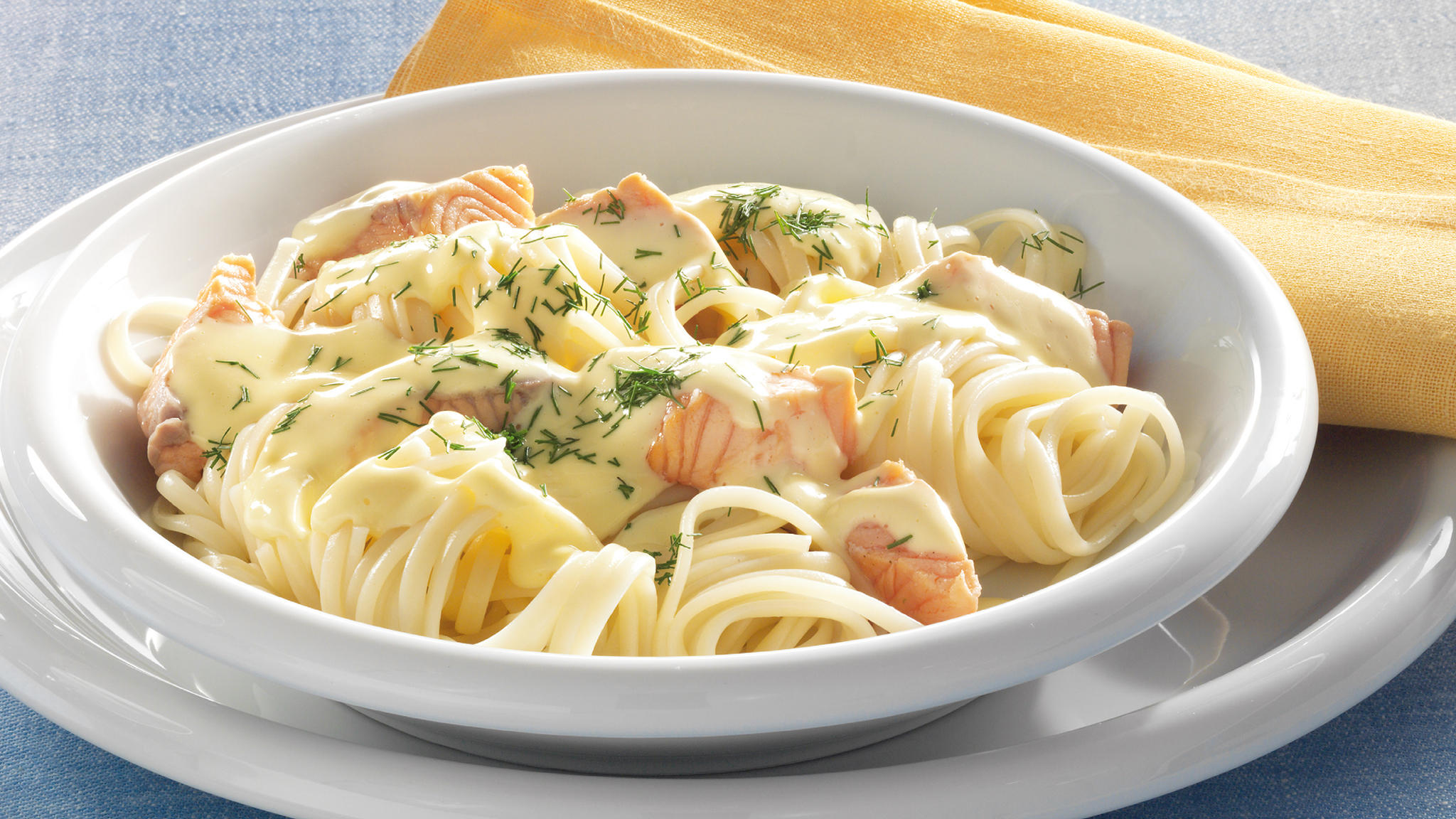 - Die Sauce zu Spaghetti und Lachs geben und unterrühren. Mit Dill dekorieren.