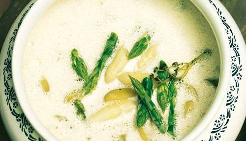 - Spargel zugeben und mit Wein ablöschen. Ca. 800 ml Wasser zugießen und etwa 15 Minuten köcheln lassen. Nach 10 Minuten die Spargelköpfe zugeben. Nach dem Kochen weitere 5 Minuten ausgeschaltet ziehen lassen.