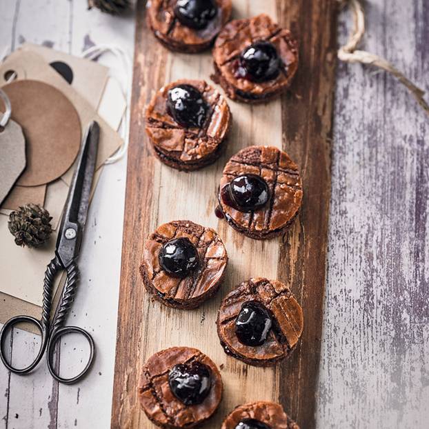 - Die unteren Plätzchenhälften sofort mit etwas Amarena-Gelee beträufeln und das obere Plätzchenteil daraufsetzen. Die halbierten Amarena-Kirschen im restlichen Gelee wenden und als Deko auf die Plätzchen setzen. Etwa 30 Minuten trocknen lassen.