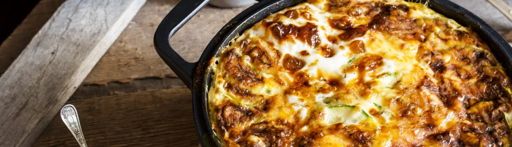 Den Boden mit Zucchinistücken bedecken. Fleisch darüber geben. Zweite Zucchinischicht einfüllen. Zum Schluß die Käsesoße zugießen.